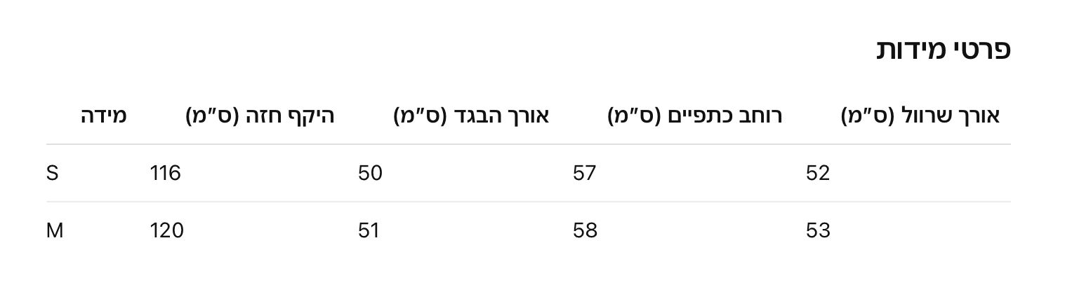 הפריט תואם את טבלת המידות ונחתך בהתאם לטבלת המידות שלנו. אנא עיינו בטבלת המידות שלנו להתאמה הטובה ביותר.
