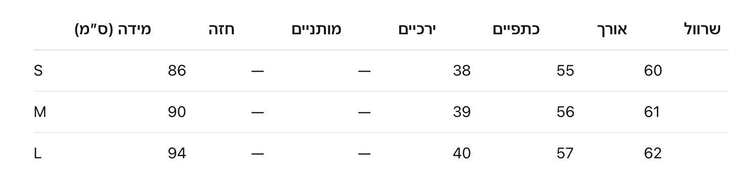 הפריט תואם את טבלת המידות ונחתך בהתאם לטבלת המידות שלנו. אנא עיינו בטבלת המידות שלנו להתאמה הטובה ביותר.