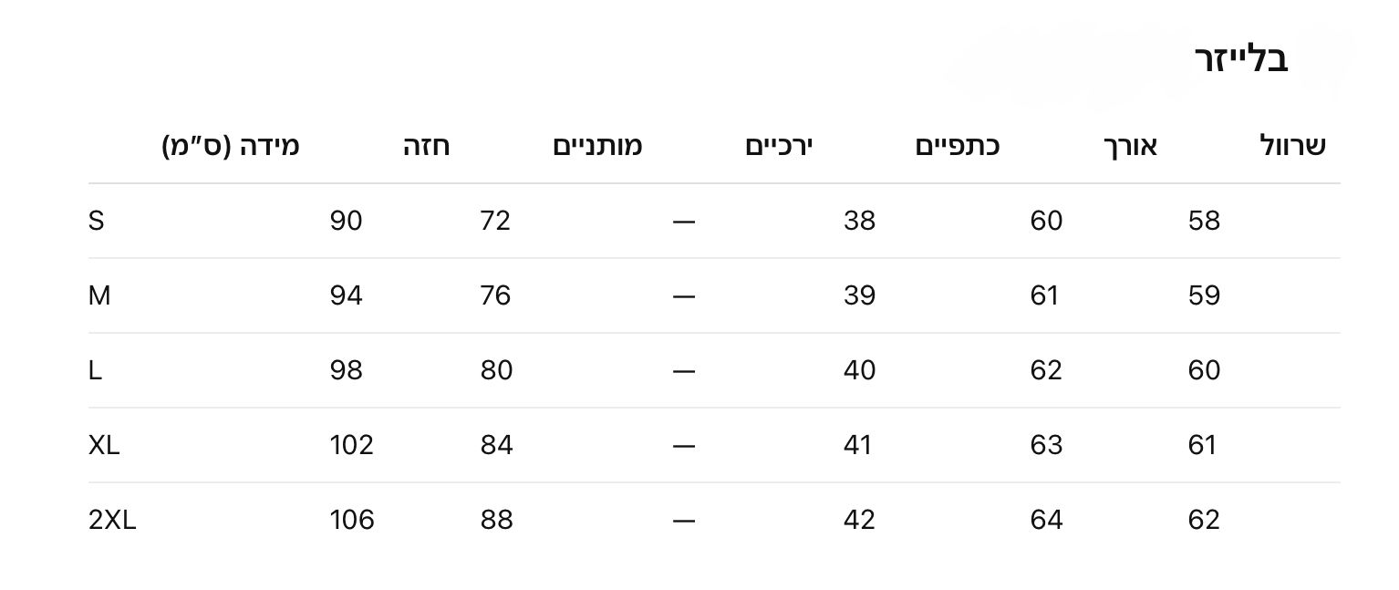 הפריט תואם את טבלת המידות ונחתך בהתאם לטבלת המידות שלנו. אנא עיינו בטבלת המידות שלנו להתאמה הטובה ביותר.
