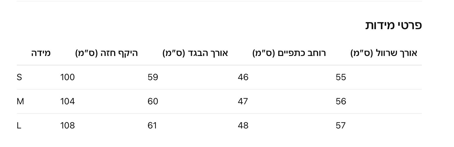 הפריט תואם את טבלת המידות ונחתך בהתאם לטבלת המידות שלנו. אנא עיינו בטבלת המידות שלנו להתאמה הטובה ביותר.