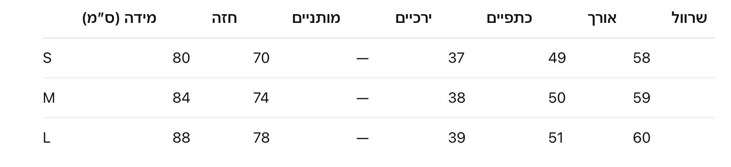 הפריט תואם את טבלת המידות ונחתך בהתאם לטבלת המידות שלנו. אנא עיינו בטבלת המידות שלנו להתאמה הטובה ביותר.