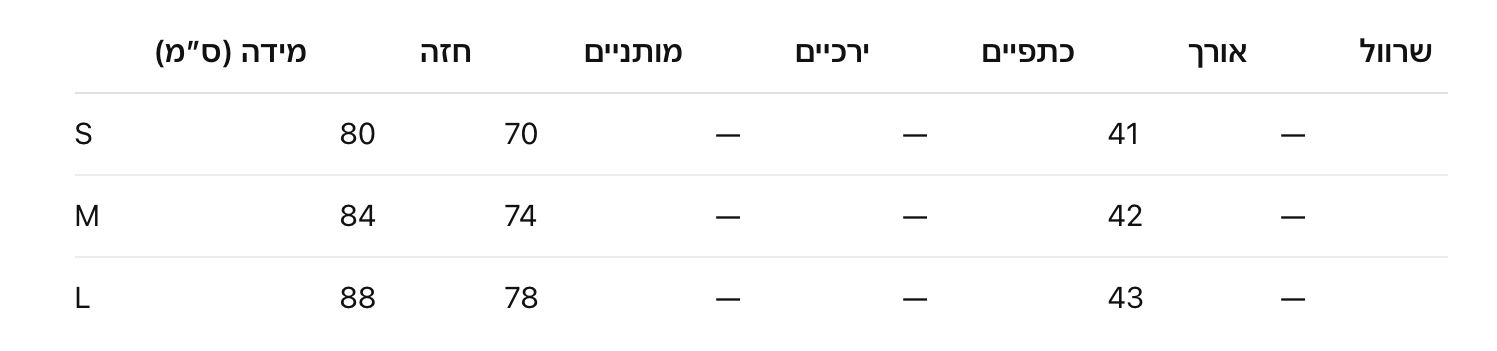הפריט תואם את טבלת המידות ונחתך בהתאם לטבלת המידות שלנו. אנא עיינו בטבלת המידות שלנו להתאמה הטובה ביותר.