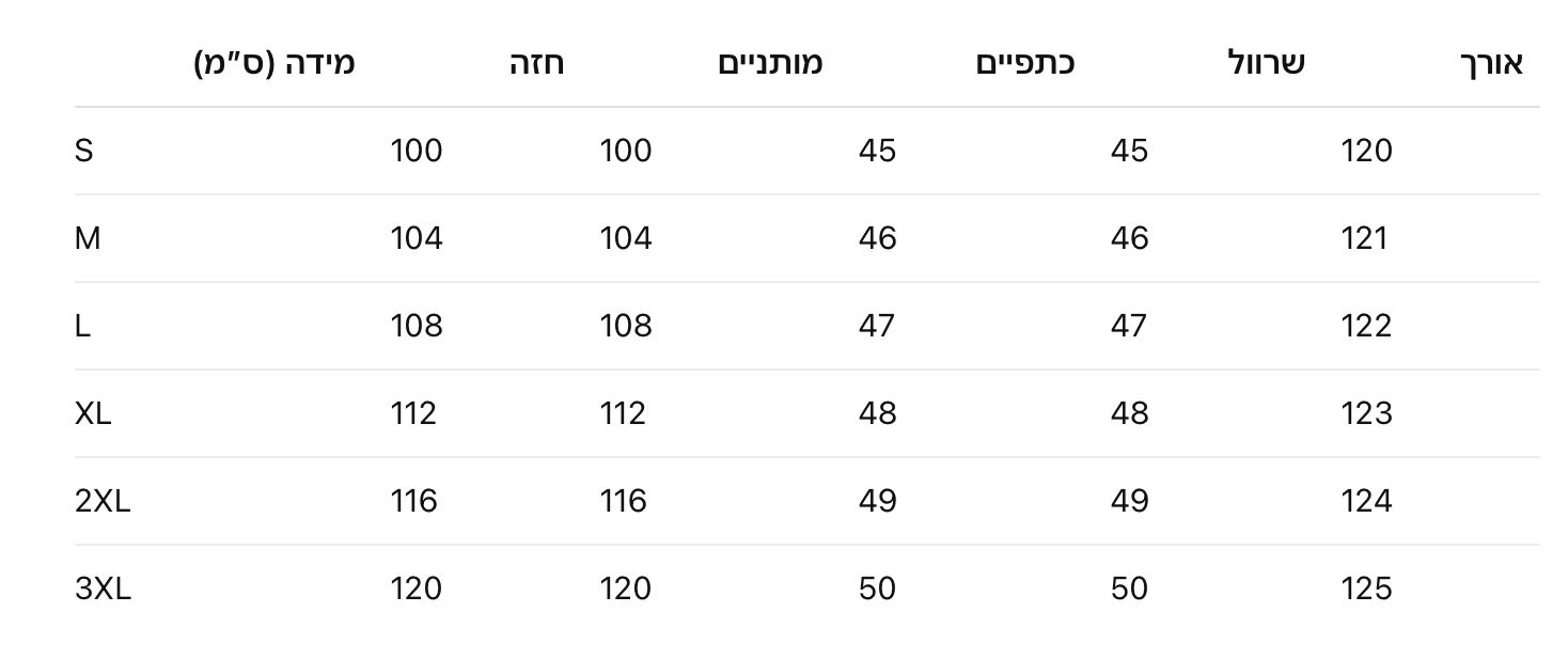 הפריט תואם את טבלת המידות ונחתך בהתאם לטבלת המידות שלנו. אנא עיינו בטבלת המידות שלנו להתאמה הטובה ביותר.