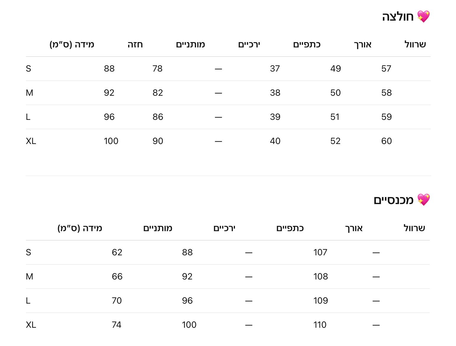הפריט תואם את טבלת המידות ונחתך בהתאם לטבלת המידות שלנו. אנא עיינו בטבלת המידות שלנו להתאמה הטובה ביותר.