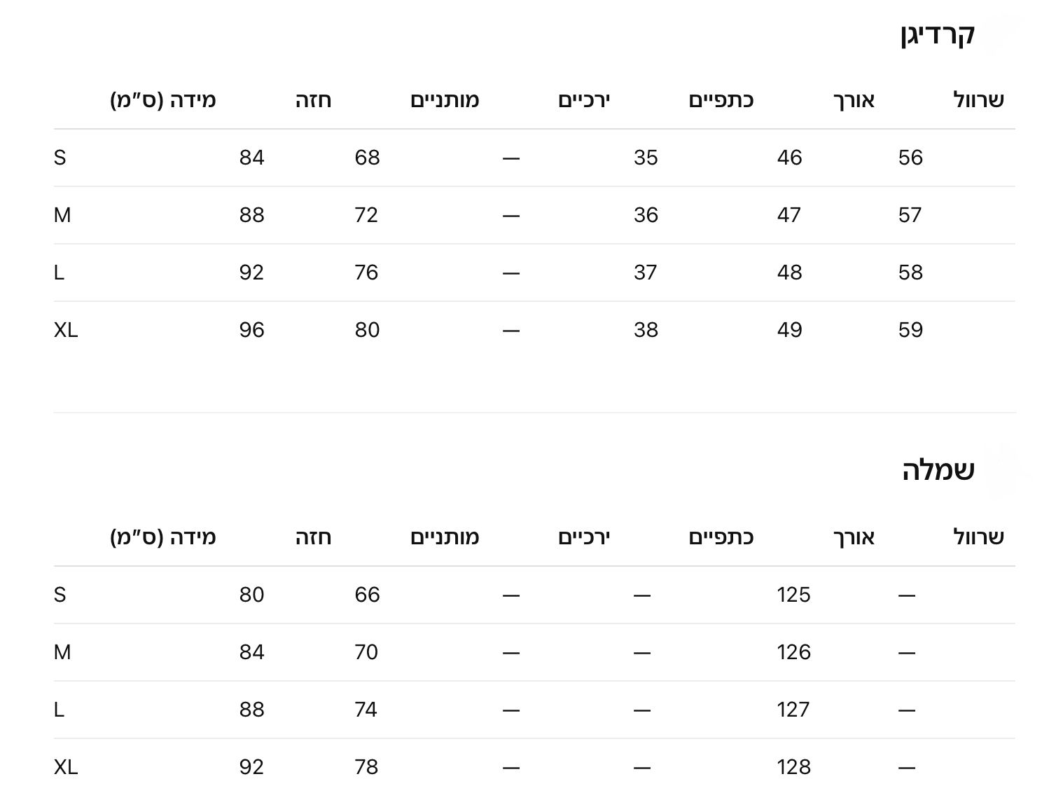 הפריט תואם את טבלת המידות ונחתך בהתאם לטבלת המידות שלנו. אנא עיינו בטבלת המידות שלנו להתאמה הטובה ביותר.