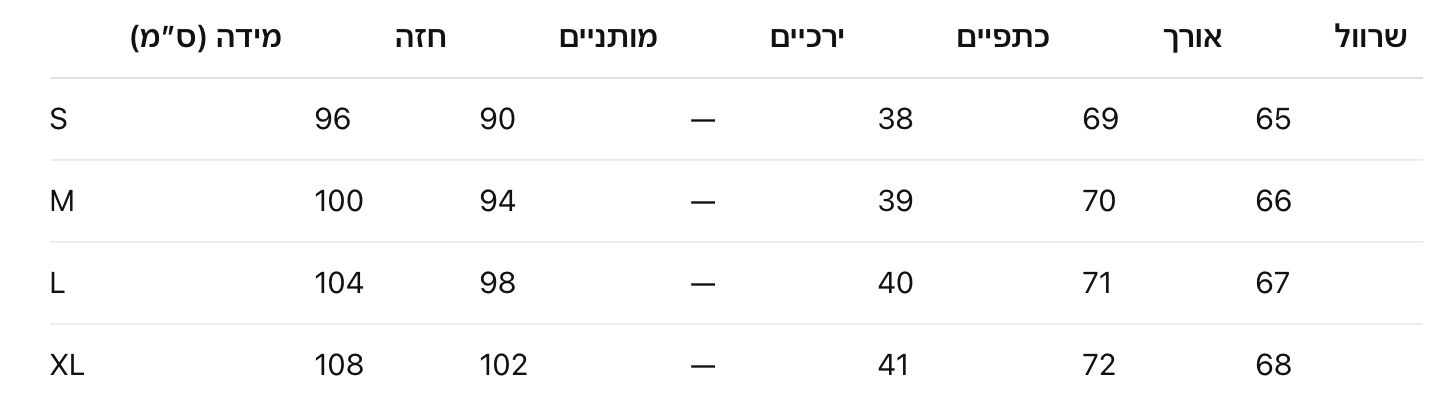 הפריט תואם את טבלת המידות ונחתך בהתאם לטבלת המידות שלנו. אנא עיינו בטבלת המידות שלנו להתאמה הטובה ביותר.