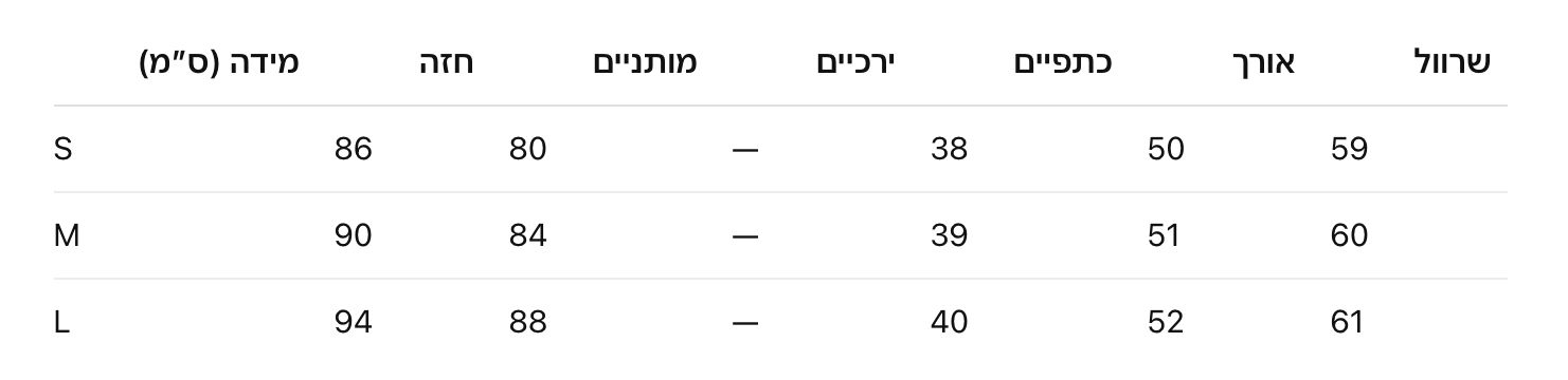הפריט תואם את טבלת המידות ונחתך בהתאם לטבלת המידות שלנו. אנא עיינו בטבלת המידות שלנו להתאמה הטובה ביותר.