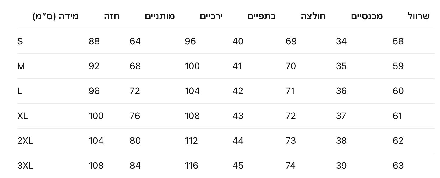 הפריט תואם את טבלת המידות ונחתך בהתאם לטבלת המידות שלנו. אנא עיינו בטבלת המידות שלנו להתאמה הטובה ביותר.