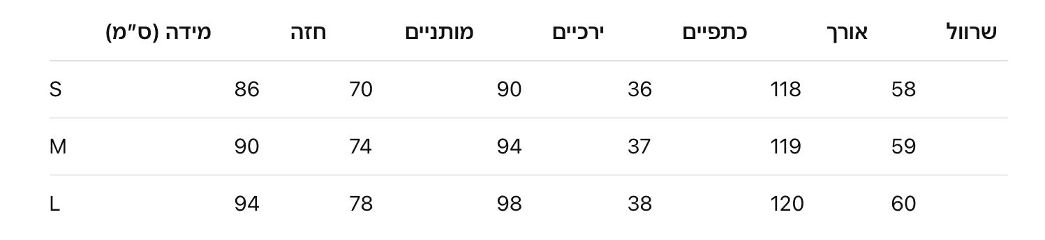 הפריט תואם את טבלת המידות ונחתך בהתאם לטבלת המידות שלנו. אנא עיינו בטבלת המידות שלנו להתאמה הטובה ביותר.